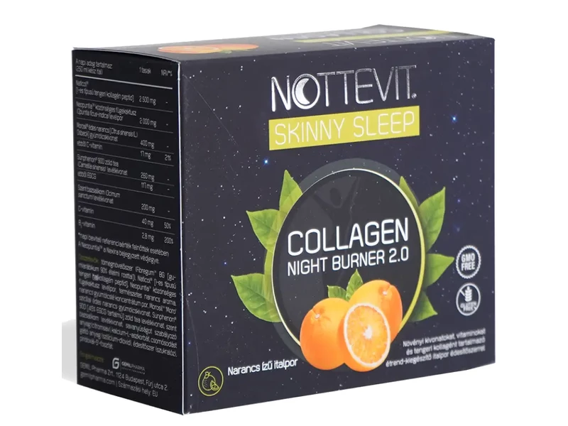 A Nottevit Skinny Sleep Collagen Night Burner egy prémium összetételű, narancs ízű, italpor formájú étrend-kiegészítő, amely éjszaka, alvás közben támogatja a kollagén-feltöltést és a zsírégetést. A termék különlegessége, hogy koffeinmentes zöld tea kivonatot, tengeri kollagén peptideket és klinikailag tesztelt Morosil™ narancskivonatot tartalmaz – mindezt egyetlen, finom italban.