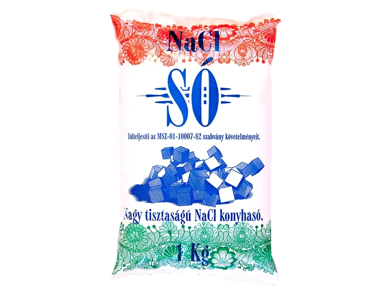 1 kg minimum 99,5% NaCl tartalmú nagy tisztaságú konyhasó.